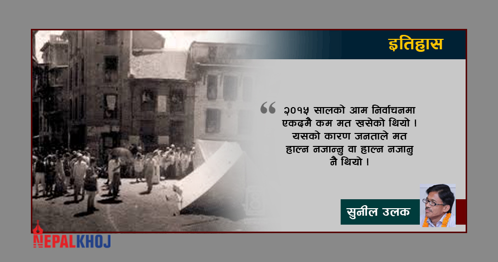 बि.स. २०१५ साल फागुन ७ गते नेपालमा आम निर्वाचन भएको थियो । देशमा प्रजातन्त्र आए संगै प्रत्येक सरकारको मुख्य एजेन्डा नै देशमा आम निर्वाचन गराउनु थियो । तर प्रत्येक सरकार आफ्नै स्वार्थमा अल्झदा आम निर्वाचन हुन सकेन । अन्तमा सुवर्ण शमशेरको अध्यक्षतामा बनेको सरकार २०१५ साल फागुन १५ गते आम निर्वाचन गर्न सक्षम भयो । उक्त निर्वाचनमा ९ पार्टीका ७८६ तथा स्वतन्त्र २६८ जनाले देशको १०९ चुनाव क्षेत्रबाट उम्मेदवारि दिएका थिए ।