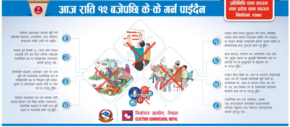 काठमाडौं । निर्वाचन आयोगले आज राति १२ बजेबाट निर्वाचन प्रचारप्रसार गर्न नपाइने जनएकाे छ । निर्वाचन प्रचार प्रसारलगायत कुनै पनि प्रकारका छलफल, अन्तरक्रिया, सभा सम्मेलन, कार्यशाला गोष्ठी आादी गर्न नपाइने जनाएको हाे ।