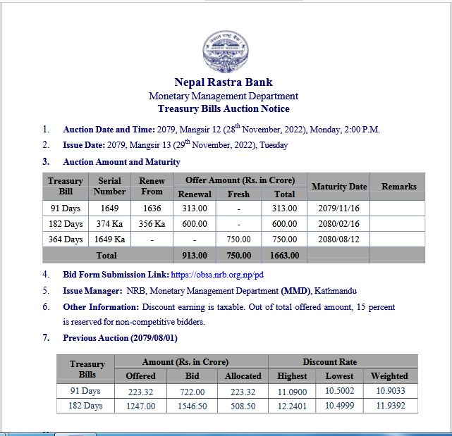 जारी मिति भने मंसिर १३ गते तोकिएको ट्रेजरी खरिदको लागि वाणिज्य बैंक, विकास बैंक र फाइनान्स कम्पनीहरुले भाग लिन पाउनेछन । बिक्री गरिने कूल ट्रेजरी मध्येमा ९१ दिने अवधिको तीन अर्ब १३ करोड, एक सय ८२ दिने अवधिको छ अर्ब र तीन सय ६४ दिने अवधिको सात अर्ब ५० करोड रुपैंयाँ बराबरको रहेको छ ।