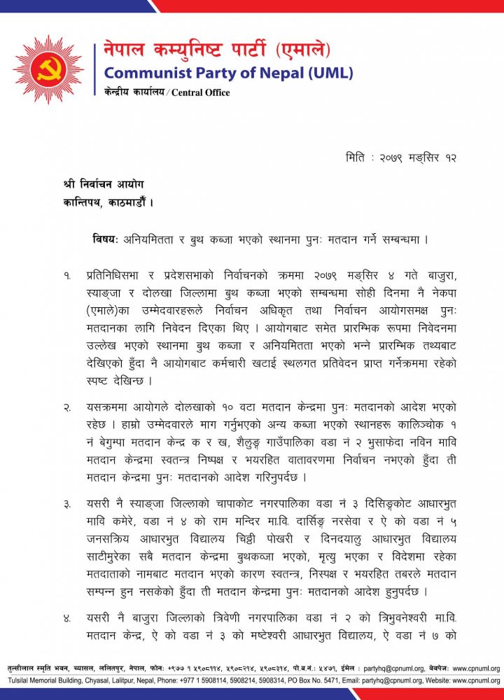 महासचिव शंकर पोखरेलले सोमवार आयोगलाई बुझाएको ध्यानाकर्षणमा सत्तापक्षबाट दोलखा,बाजुरा तथा स्याङजामा बुथ कब्जा भएको भन्दै सबै ठाउँमा पुनः मतदान गराउन माग गरिएको छ ।