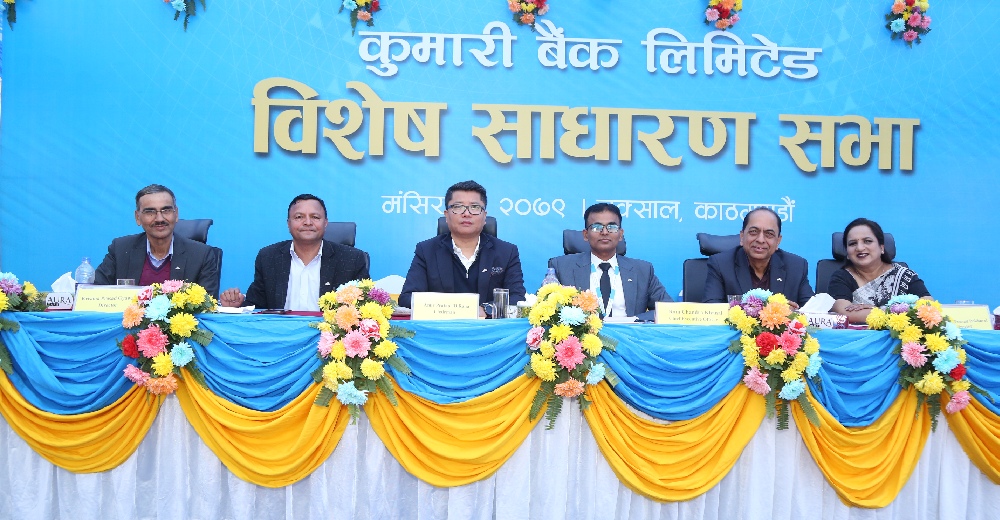 काठमाडौं । कुमारी बैंक लि.को विशेष साधारण सभा आइतबार कुमारी बैंक लिमिटेड, नक्साल कार्यालय, काठमाण्डौंमा संचालक समितिका अध्यक्ष अमिर प्रताप ज.व.राणाज्यूको अध्यक्षतामा सम्पन्न भएको छ ।