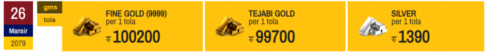 त्यस्तै, तेजाबी सुनको भाउ ३ सय रुपैयाँले घटेको छ । तेजाबी सुन प्रतितोला ९९ हजार ७ रुपैयाँमा कारोबार भइरहेको नेपाल सुनचाँदी व्यवसायी महासंघले जनाएको छ । हिजाे तेजाबी सुन प्रतितोला १ लाख रुपैयाँमा कारोबार भएको थियो ।