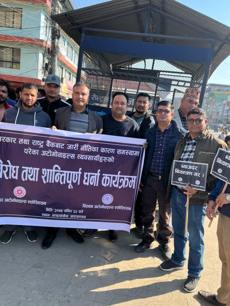 व्यवसायीहरुले सरकार विरुद्धका नारा लेखिएका प्लेकार्ड तथा व्यानर बोकेर नारायणगढको लायन्स चौक र हेटौडाको बुद्धचोकमा उत्रिएका हुन । सरकारको पछिल्लो नीतिले अटोमोबाइल्स व्यवसायीहरु नै धरासायी हुन पुगेको उनीहरुको आरोप छ ।