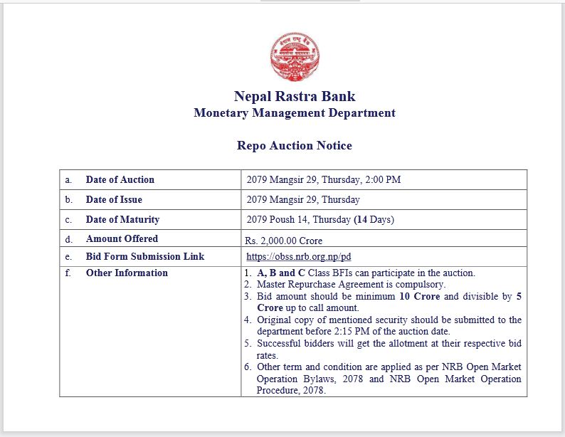 रिपो खरिदको लागि बाणिज्य बैंक, बिकास बैंक र फाईनान्स कम्पनीहरुले भाग लिएका थिए । रिपोको परिपक्व हुने अवधि १४ दिन अर्थात यही पुस १४ गतेसम्म तोकिएको राष्ट्र बैंकले जनाएको छ ।