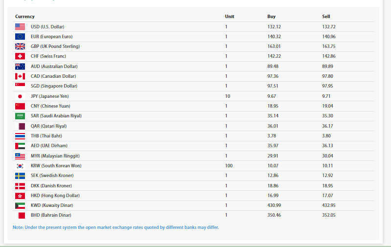 त्यस्तै, युरो एकको खरिददर १४० रुपैयाँ ३२ पैसा र बिक्रीदर १४० रुपैयाँ ९६ पैसा रहेको बैंकले जनाएको छ । त्यस्तै, बेलायती पाउन्ड एकको खरिददर १६३ रुपैयाँ ०१ पैसा र बिक्रीदर १६३ रुपैयाँ ७५ पैसा रहेको छ भने, कतारी रियाल एकको खरिददर ३६ रुपैयाँ ०१ पैसा र बिक्रीदर ३६ रुपैयाँ १७ पैसा रहेको राष्ट्र बैंकले जनाएको छ ।