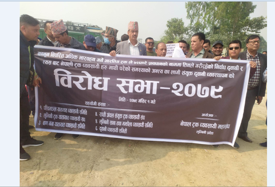 लुम्बिनी ट्रक यातायात व्यवसायी सङ्घ, पश्चिमाञ्चल यातायात व्यवसायी समिति, वाणगङ्गा यातायात व्यवसायी समिति, राप्ति अञ्चल संयुक्त ट्रक व्यवसायी सङ्घ, लुम्बिनी साना तथा मझौला व्यवसायी समिति र ढुवानी व्यवसायी समितिले आज संयुक्त विज्ञप्तिसहित भैरहवा भन्सार कार्यालय परिसरमा नारा जुलुससहित विरोध प्रर्दशन गरेका हुन् । ट्रक व्यवसायी महासङ्घ नेपालका केन्द्रीय उपाध्यक्ष लेखराज पोखरेलले भारतीय गाडीले ओभरलोड बोक्दा नेपाली व्यवसायी समस्यामा पर्नुका साथै सडक भत्किएको बताए ।
