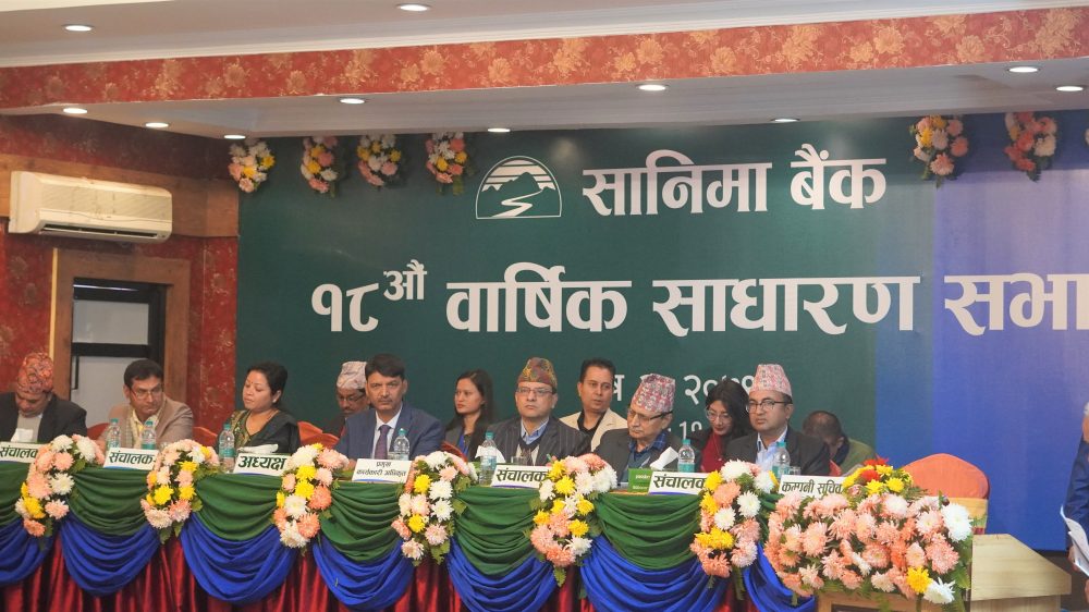 काठमाडौं । सानिमा बैंक लिमिटेडले आईतबारका दिन १८ औं वार्षिक साधारण सभा सफलतापूर्वक सम्पन्न गरेको छ । बैंकका अध्यक्ष तुक प्रसाद पौडेलको अध्यक्षतामा भएको उक्त सभाले संचालक समितिले प्रस्ताव गरे अनुसार हालको चुक्ता पुँजीको १० प्रतिशत बोनस सेयर र शून्य दशमलव ९८ प्रतिशत नगद लाभांश प्रदान गर्ने प्रस्ताव पारित गरेको छ ।