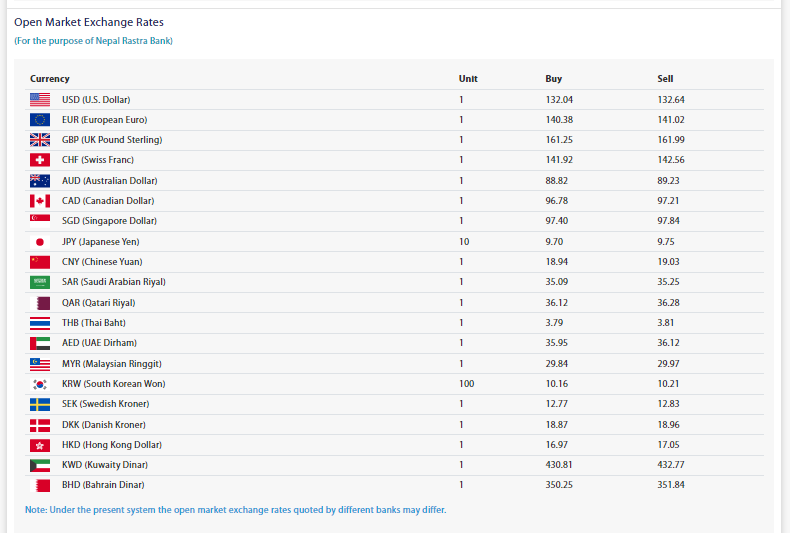 त्यसैगरी, जापानी येन १० को खरिददर ९ रुपैयाँ ७० पैसा रहेको छ भने बिक्रीदर ९ रुपैयाँ ७५ पैसा रहेको छ । यसैगरी साउदी रियाल एकको खरिददर ३५ रुपैयाँ रहेको ०९ पैसा रहेको छ भने, बिक्रीदर ३५ रुपैयाँ २५ पैसा रहेको राष्ट्र बैंकले जनाएको छ ।