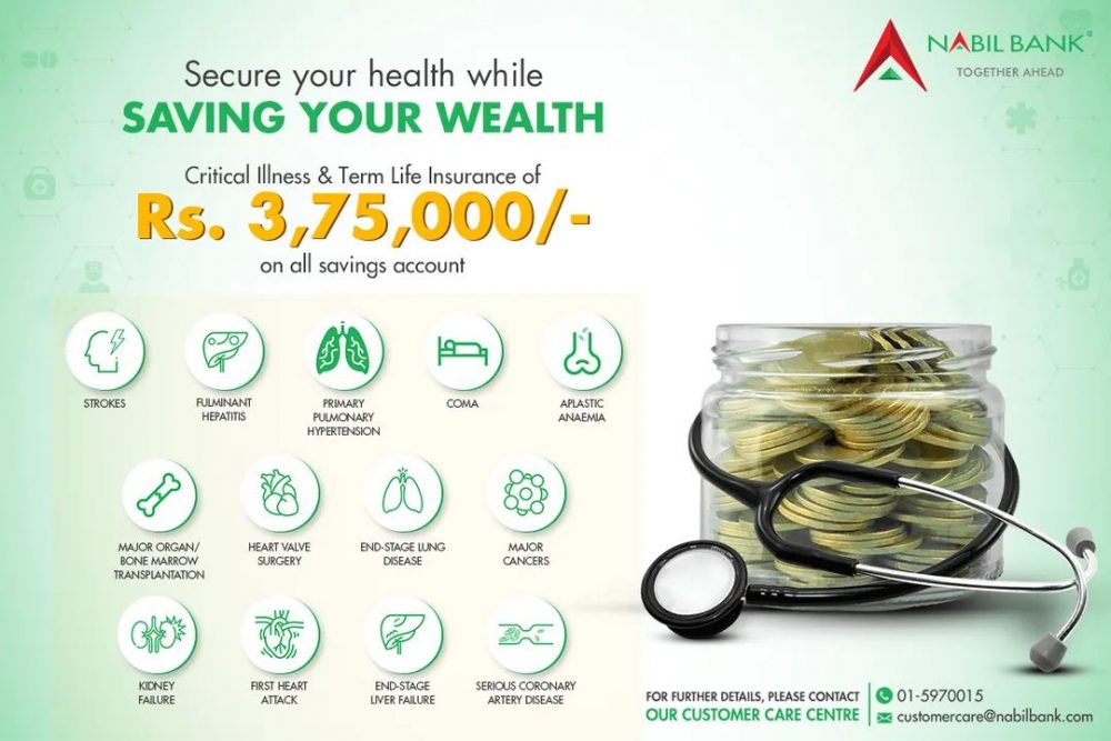 नबिल बैंकले विभिन्न १३ घातक रोगहरू जस्तै किड्नी फेलर, क्यान्सर, हर्ट अट्याक, लिभर फेलर, बोनम्यारो ट्रान्सप्लान्टेसन, हर्ट भल्भ सर्जरी, इन्ड स्टेज लङ डिजिज, कोमा, पल्मोनरी हाइपरटेन्सन, स्ट्रोक, परमानेन्ट हेपाटाइटिस, अप्लास्टिक एनिमिया तथा सिरयस कोनोनरी आर्टरी डिजिजका लागि बीमा सुविधा दिने गरेको छ ।