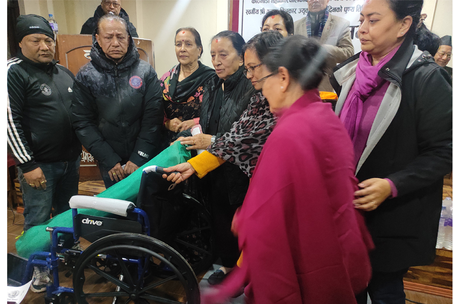 प्रजातन्त्र सेनानी चित्रकारको पुण्य तिथिमा ह्वील चियर र स्टेचर हस्तान्तरण