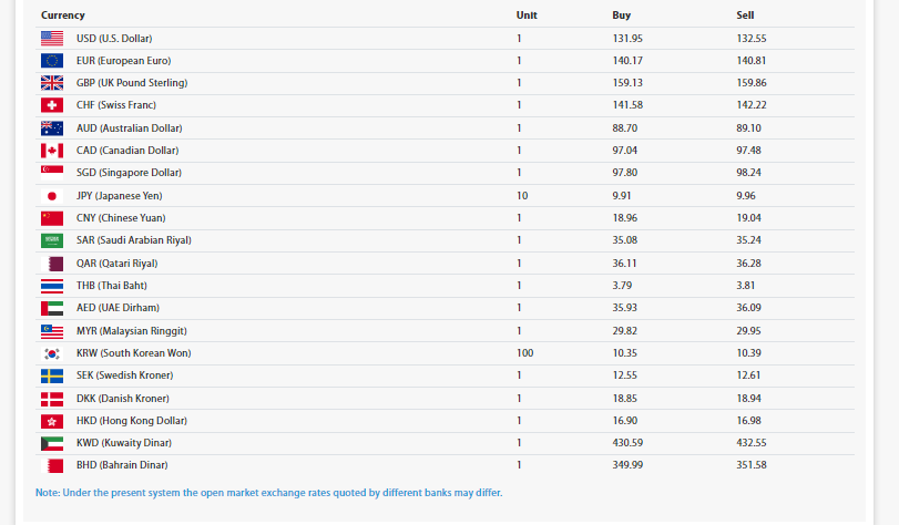 त्यस्तै, युरो एकको खरिददर १४० रुपैयाँ १७ पैसा र बिक्रीदर १४० रुपैयाँ ८१ पैसा रहेको बैंकले जनाएको छ । त्यस्तै, बेलायती पाउन्ड एकको खरिददर १५९ रुपैयाँ १३ पैसा र बिक्रीदर १५९ रुपैयाँ ८६ पैसा रहेको छ भने, कतारी रियाल एकको खरिददर ३६ रुपैयाँ ११ पैसा र बिक्रीदर ३६ रुपैयाँ २८ पैसा रहेको राष्ट्र बैंकले जनाएको छ ।