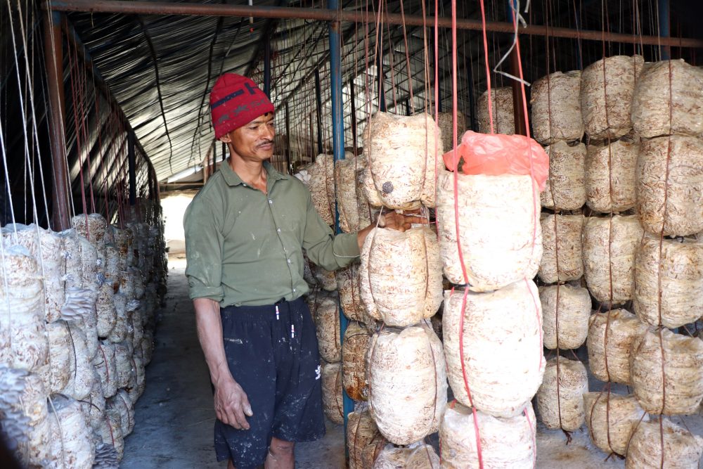 सुर्खेतको वीरेन्द्रनगर-११, चौखेढुङ्गस्थित दुर्गा पशु कृषि तथा च्याउ फार्ममा काम गर्दै फार्मका सञ्चालक इमानसिं बस्नेत । उनको च्याउ फार्ममा वार्षिक दुई करोड रुपैयाँभन्दा बढीको कारोबार हुने गर्दछ । तस्बिर : सुरेश आचार्य