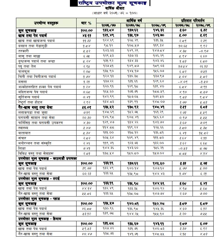 गत वर्षमा खाद्य तथा पेय पदार्थ समूह अन्तर्गत घ्यू तथा तेल र दाल तथा गेडागुडी र गैर–खाद्य तथा सेवा समूह अन्तर्गत यातायात र शिक्षा उपसमूहको मुद्रास्फीति अघिल्लो वर्षको तुलनामा उल्लेख्य रुपमा बढ्न गएको छ। गत वर्षमा वार्षिक औसत उपभोक्ता मुद्रास्फीति काठमाडौं उपत्यकामा ५.७३ प्रतिशत, तराईमा ६।४१ प्रतिशत, पहाडमा ६.८७ प्रतिशत र हिमालमा ६.०७ प्रतिशत रहेको छ। अघिल्लो वर्ष यस्तो मुद्रास्फीति काठमाडौं उपत्यकामा ३.३३ प्रतिशत, तराईमा ३.६८ प्रतिशत, पहाडमा ३.८७ प्रतिशत र हिमालमा २.८७ प्रतिशत रहेको थियो।
