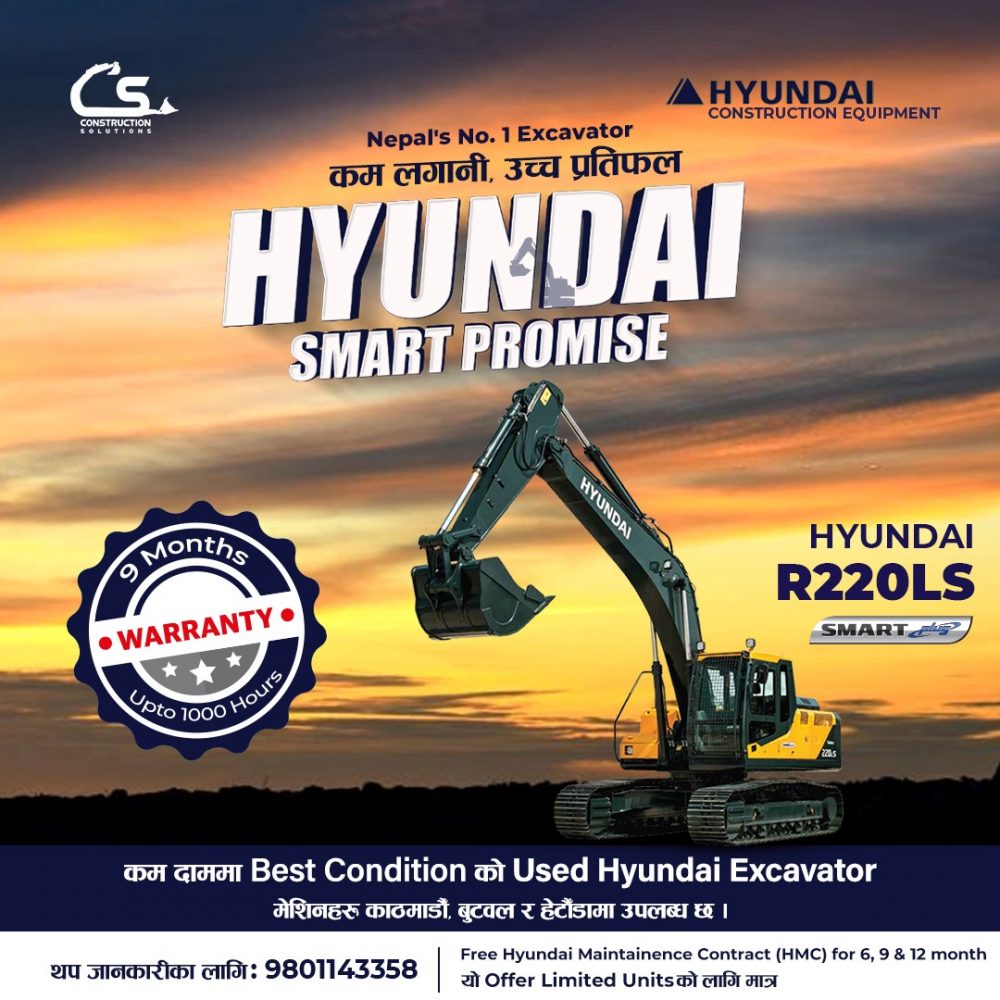 काठमाडौं । हुन्डाइ कन्स्ट्रक्सन इक्विप्मन्ट नेपालले निर्माण व्यवसायीहरूलाई लक्षित गरेर ‘हुन्डाइ स्मार्ट प्रमिस’ योजना ल्याएको छ । यो योजना अन्तर्गत कम लगानीमै राम्रो कन्डिसनको सेकेन्ड ह्यान्ड एक्जाभेटर सुपथ मूल्यमा पाउन सकिने व्यवस्था रहेको छ ।