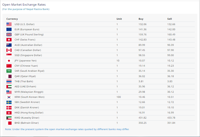 त्यसैगरी, जापानी येन १० को खरिददर १० रुपैयाँ ०२ पैसा रहेको छ भने बिक्रीदर १२ रुपैयाँ १२ पैसा रहेको छ । यसैगरी साउदी रियाल एकको खरिददर ३५ रुपैयाँ रहेको १४ पैसा रहेको छ भने, बिक्रीदर ३५ रुपैयाँ ३०पैसा रहेको राष्ट्र बैंकले जनाएको छ ।