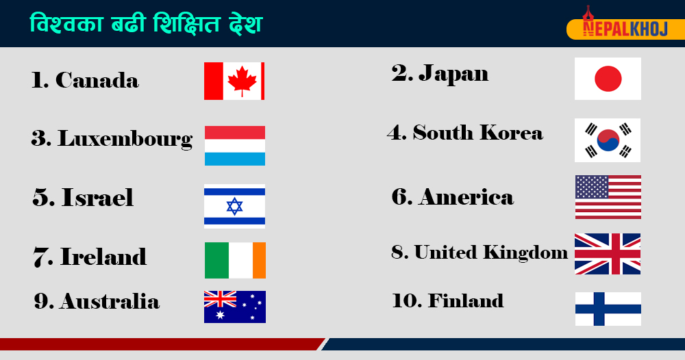 ओईसीडीको प्रतिवेदनअनुसार क्यानाडा, जापान र लक्जमबर्ग विश्वका शीर्ष तीन शिक्षित देश हुन् । यहाँ २५ देखि ३४ वर्षको जनसंख्या सबैभन्दा शिक्षित छ । ओईसीडीको तथ्यांक अनुसार शीर्ष दस शिक्षित देश :