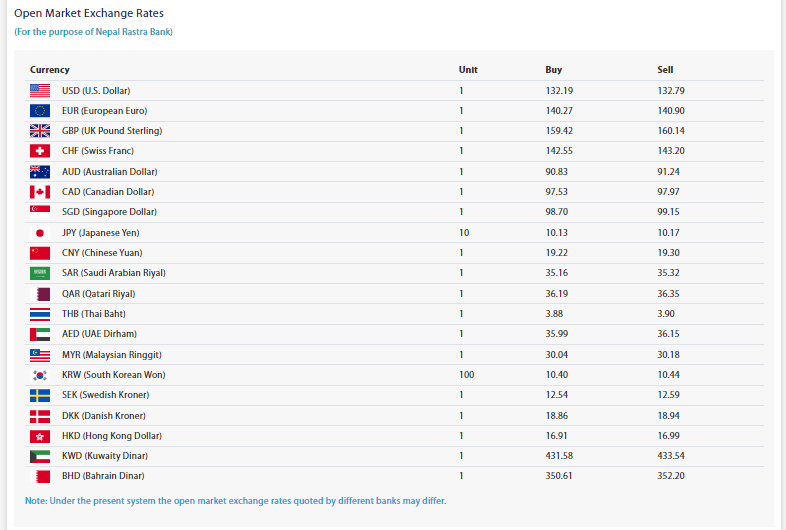 त्यसैगरी, जापानी येन १० को खरिददर १० रुपैयाँ १३ पैसा रहेको छ भने बिक्रीदर १० रुपैयाँ १७ पैसा रहेको छ । यसैगरी साउदी रियाल एकको खरिददर ३५ रुपैयाँ रहेको १६ पैसा रहेको छ भने, बिक्रीदर ३५ रुपैयाँ ३२ पैसा रहेको राष्ट्र बैंकले जनाएको छ ।