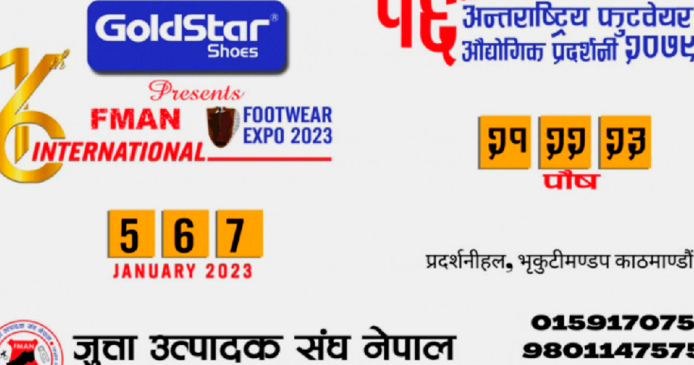 काठमाडौं । नेपाली उत्पादनको बजारीकरण गर्ने र आर्थिक समृद्धिको आधार तयार पार्ने उद्देश्यसहित भृकुटीमण्डपमा १७औँ अन्तर्राष्ट्रिय फुटवेयर औद्योगिक मेला सुरु भएको छ । तीन दिनसम्म सञ्चालन हुने मेलाको राष्ट्रपति विद्यादेवी भण्डारीले आज उद्घाटन गरे ।