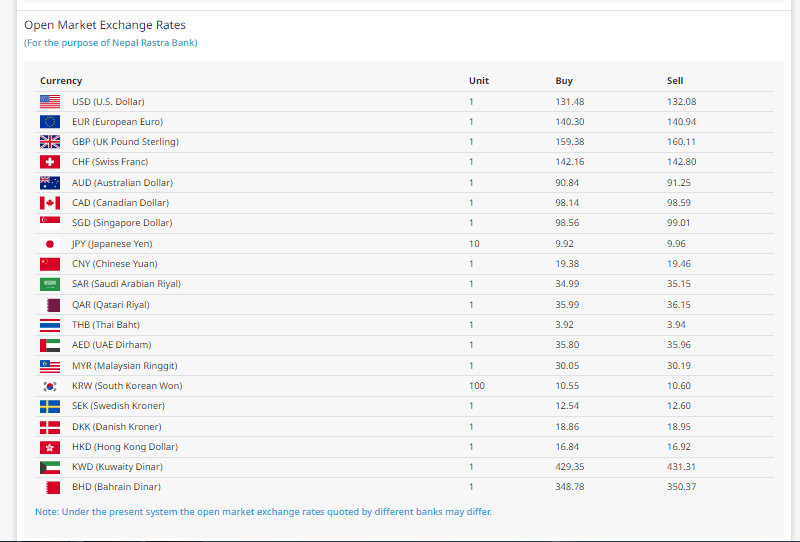 त्यस्तै, युरो एकको खरिददर १४० रुपैयाँ ३० पैसा र बिक्रीदर १४० रुपैयाँ ९४ पैसा रहेको बैंकले जनाएको छ । त्यस्तै, बेलायती पाउन्ड एकको खरिददर १५९ रुपैयाँ ३८ पैसा र बिक्रीदर १६० रुपैयाँ ११ पैसा रहेको छ भने, कतारी रियाल एकको खरिददर ३५ रुपैयाँ ९९ पैसा र बिक्रीदर ३६ रुपैयाँ १५ पैसा रहेको राष्ट्र बैंकले जनाएको छ ।