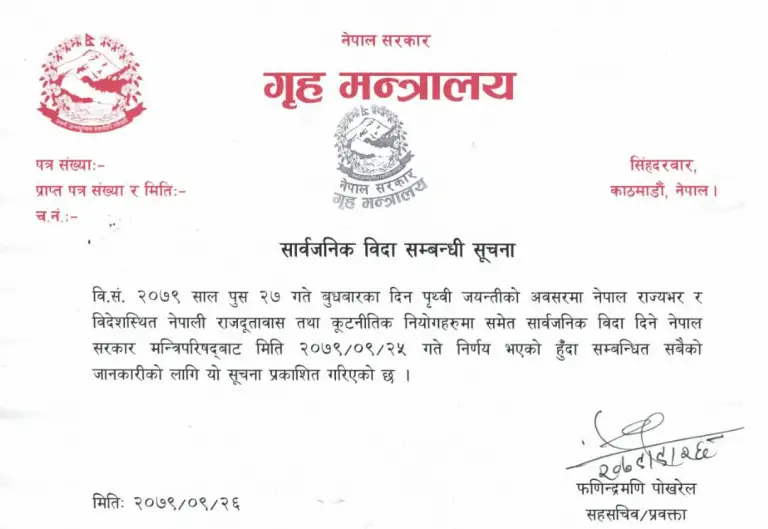 मंगलबार एक सूचना जारी गर्दै गृह मन्त्रालयले सोमबार बसेको मन्त्रिपरिषद् बैठकको निर्णयअनुसार बुधबार पृथ्वी जयन्तीको अवसरमा सार्वजनिक बिदा दिइएको जनाएकाे छ ।