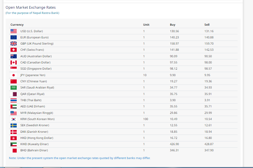 त्यस्तै, युरो एकको खरिददर १४० रुपैयाँ २३ पैसा र बिक्रीदर १४० रुपैयाँ ८८ पैसा रहेको बैंकले जनाएको छ । त्यस्तै, बेलायती पाउन्ड एकको खरिददर १५८ रुपैयाँ ९७ पैसा र बिक्रीदर १५९ रुपैयाँ ७० पैसा रहेको छ भने, कतारी रियाल एकको खरिददर ३५ रुपैयाँ ७५ पैसा र बिक्रीदर ३५ रुपैयाँ ५१ पैसा रहेको राष्ट्र बैंकले जनाएको छ ।
