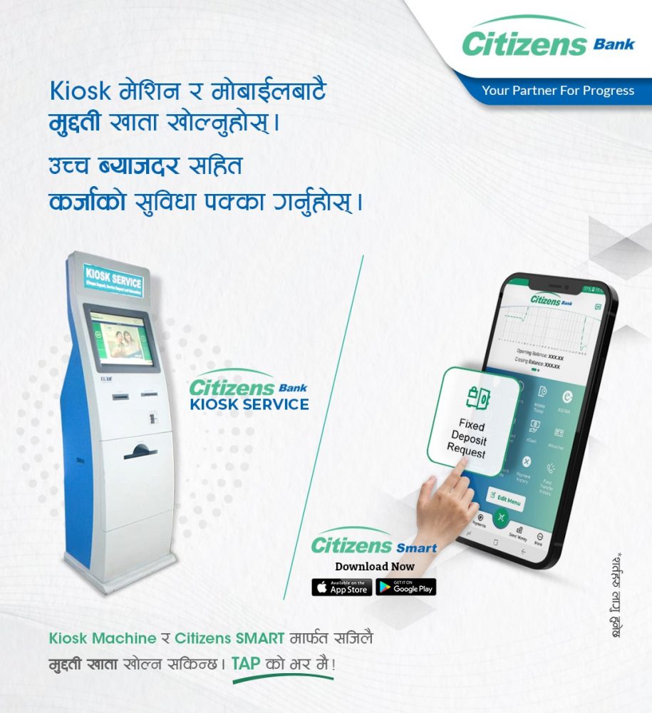 बैकले ग्राहकको अनुभव अभिवृद्धि गर्न र भौतिक रुपमा शाखामा जाँदा हुने झन्झट कम गर्न, सिटिजन्स स्मार्ट एपबाट सिधै मुद्दती निक्षेप खाता खोल्ने नयाँ सुविधा ल्याएको छ , जहाँ ग्राहकहरूले विभिन्न मुद्दती निक्षेप योजनाहरू, अवधि र इच्छित रकम चयन गर्न सक्नेछन् । फिक्स्ड डिपोजिट रकमको न्यूनतम सीमा १० हजार रुपैयाँ र अधिकतम सिमा ५० लाख रुपैयाँमा सेट गरिएको छ । त्यसैगरी, सिटिजन्स स्मार्ट एपबाट मुद्दती निक्षेप अनुरोध सुविधा पनि ल्याईएको छ जसमा मुद्दती निक्षेप खाता भएका ग्राहकहरूले मुद्दती निक्षेप रकमको ९० प्रतिशतसम्म मुद्दती निक्षेप खातामा ऋणको लागि अनुरोध गर्न सक्नेछन् ।