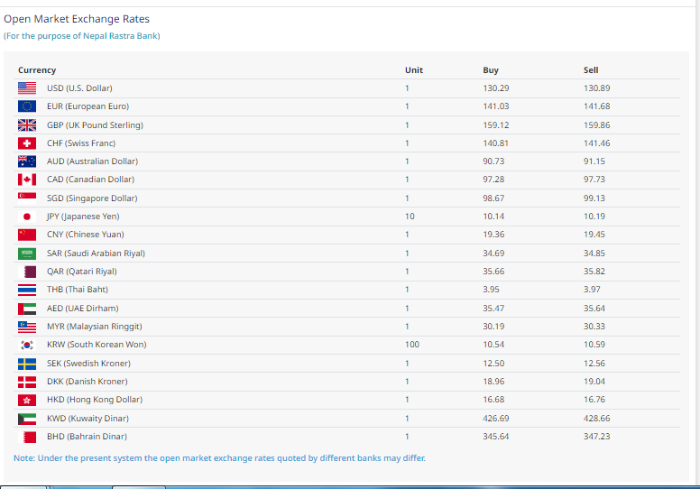 काठमाडौं । नेपाल राष्ट्र बैंकले आज (मंगलबार)का लागि विदेशी मुद्राको विनिमयदर तोकेको छ । नेपाल राष्ट्र बैंककाअनुसार विदेशी मुद्राको विनिमयदर अमेरिकी एक डलरको खरिददर १३० रुपैयाँ २९ पैसा र बिक्रीदर १३० रुपैयाँ ८९ पैसा रहेको छ ।