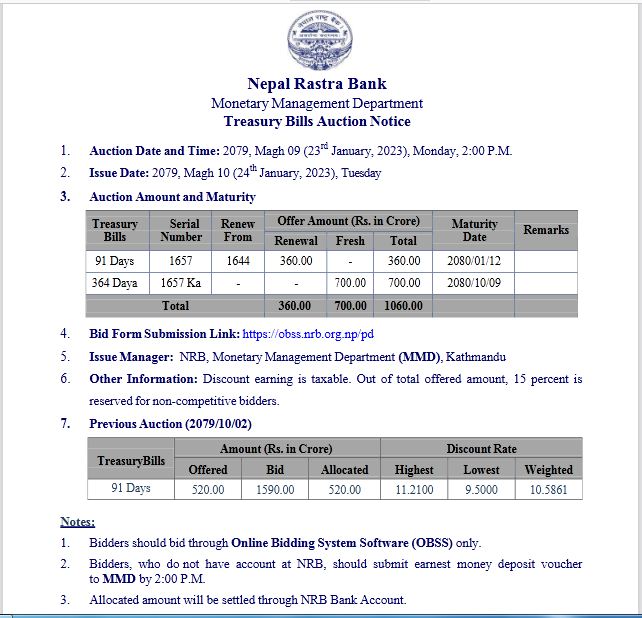 जारी मिति भने माघ १० गते तोकिएको ट्रेजरी खरिदको लागि वाणिज्य बैंक, विकास बैंक र फाइनान्स कम्पनीहरुले भाग लिन पाउनेछन । बिक्री गरिने कुुल ट्रेजरी मध्येमा ९१ दिने अवधिको सात अर्ब र तीन सय ६४ दिने अवधिको तीन अर्ब ६० करोड रुपैंयाँ बराबरको रहेको छ ।