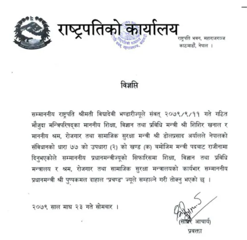 श्रम, रोजगार तथा सामाजिक सुरक्षामन्त्री डोलप्रसाद अर्याल, शिक्षा, विज्ञान तथा प्रविधिमन्त्री शिशिर खनाल र स्वास्थ्य तथा जनसंख्या राज्यमन्त्री तोसिमा कार्कीको राजीनामा राष्ट्रपति भण्डारीले स्वीकृत गरेको राष्ट्रपतिको कार्यालयका प्रवक्ता सागर आचार्यले विज्ञप्तिमार्फत सोमबार जानकारी दिएका छन् ।