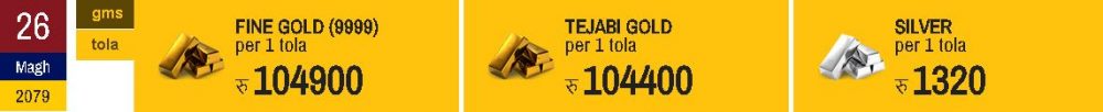 त्यसैगरी, आज चाँदीको भाउ ५ रुपैयाँले बढेको छ । चाँदी आज प्रतितोला १३ सय २० रुपैयाँमा कारोबार भइरहेको महासंघले जनाएको छ । बुधबार चाँदी प्रतितोला १३ सय १५ रुपैयाँमा कारोबार भएको महासंघले जनाएको छ ।