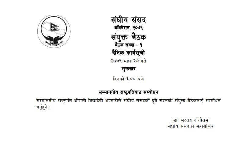 संसद्को दुवै सदनको संयुक्त बैठक बस्दै, राष्ट्रपतिले संबोधन गर्ने