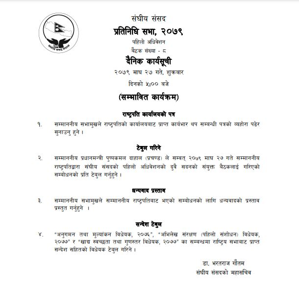 साँझ ५ बजे संसद्को दोस्रो बैठक बस्ने कार्यसूची रहेको छ । आजको दोस्रो बैठकमा सभामुखले राष्ट्रपतिको कार्यालयबाट प्राप्त कार्यभार थप सम्बन्धी पत्रको व्यहोरा पढेर सुनाउने, प्रधानमन्त्री पुष्पकमल दाहाल ‘प्रचण्ड’ले २०७९ माघ २७ गते राष्ट्रपतिद्वारा संघीय संसदको पहिलो अधिवेशनको दुवै सदनको संयुक्त बैठकलाई गरिएको सम्बोधनको प्रति टेबुल गर्ने सम्भावित कार्यसूची रहेको छ ।