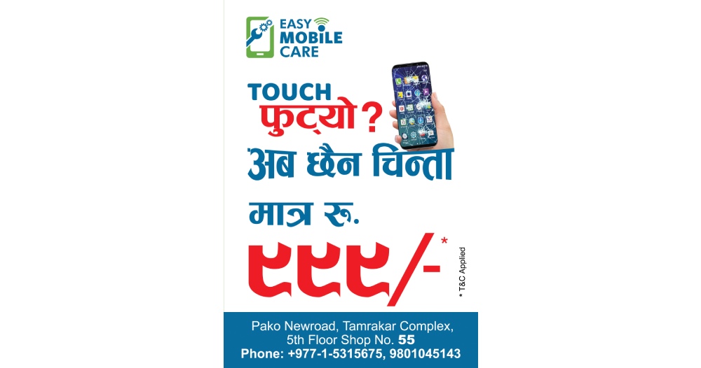 काठमाडौं । विगत लामो समयदेखी मोबाइल फोन मर्मत सम्बन्धित सेवा संचालन गर्दै आएको न्यूरोडस्थित ताम्राकार कम्प्लेक्सको पाँचौ तल्लामा रहेको ख्यातिप्राप्त कम्पनी इजी मोबाइल केयरप्रालिले नेपालमा नै पहिलो पटक ‘मात्र रु.९९९ मा मोबाईल फोनको डिस्प्लेको टच’ फेर्ने सुविधा ल्याएको हो ।