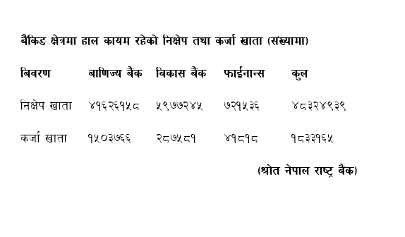 राष्ट्र बैंकका अनुसार चालु आवको पछिल्लो अवधिमा बाँणिज्य बैंकहरुमा मात्र रहेको कुल निक्षेप खाताको संख्या चार करोड १६ लाख २६ हजार एक सय ५८ पुगेको छ । यस अवधिमा बाँणिज्य बैंकहरुमा कुल १५ लाख तीन हजार सात सय ६६ वटा कर्जा खाताहरु सञ्चालनमा रहेको देखिएको छ । बिकास बैंकहरुमा भने कुल निक्षेप खाताको संख्या ५९ लाख ७७ हजार दुई सय ४५ पुगेको छ । यस अवधिमा बिकास बैंकहरुमा दुई लाख ८७ हजार पाँच सय ८१ वटा कर्जा खाताहरु सञ्चालनमा रहेको देखिएको छ ।