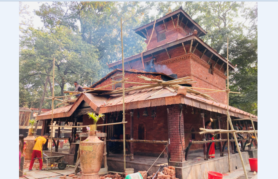 ‘मन्दिरको भित्री संरचना जीर्ण भएको थियो, तामाको छानो चुहिने भएपछि जिर्णोद्धारसँगै मर्मतसम्भार गरिएको हो’, उनले भने, ‘दुई चरणमा गरेर दुई महिनामा कलात्मक बनाइएको हो ।’ मन्दिरको पूर्वपट्टिको सत्तल र हवन अग्निकुण्डलाई कलात्मक बनाइँदै छ । सिमेन्ट र ढुङ्गाजडित संरचना हटाएर कलात्मक काठ र धातुको प्रयोग गरेर संरचना बनाउने योजना रहेको खड्का बताउँछन् । रु २६ लाखको लागतमा मन्दिरको जिर्णोद्धार गरिएको हो ।