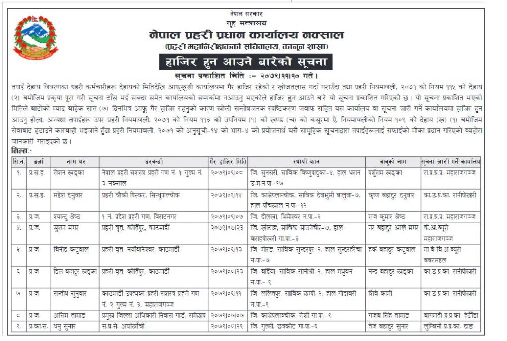 गत कात्तिकदेखि जानकारीबिना हाजिर नभएका ९ जनाका नाममा सूचना जारी गर्दै प्रहरी प्रधान कार्यालयले ७ दिभित्र सम्पर्कमा रहन जारी सुचनामा उल्लेख छ । सन्तोषजनक स्पष्टीकरणसहित हाजिर नभए सेवाबाट हटाइने नेपाल प्रहरीले जनाएको छ ।