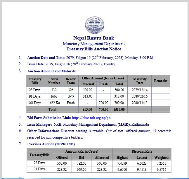 जारी मिति भने फागुन १६ गते तोकिएको टे«जरी बिल खरिदको लागि वाणिज्य बैंक, विकास बैंक र फाइनान्स कम्पनीहरुले भाग लिन पाउनेछन । बिक्री गरिने कुुल टे«जरी मध्येमा २८ दिने अवधिको पाँच अर्ब, ९१ दिने अवधिको तीन अर्ब १३ करोड र तीन सय ६४ दिने अवधिको सात अर्ब रुपैंयाँ बराबरको रहेको छ ।