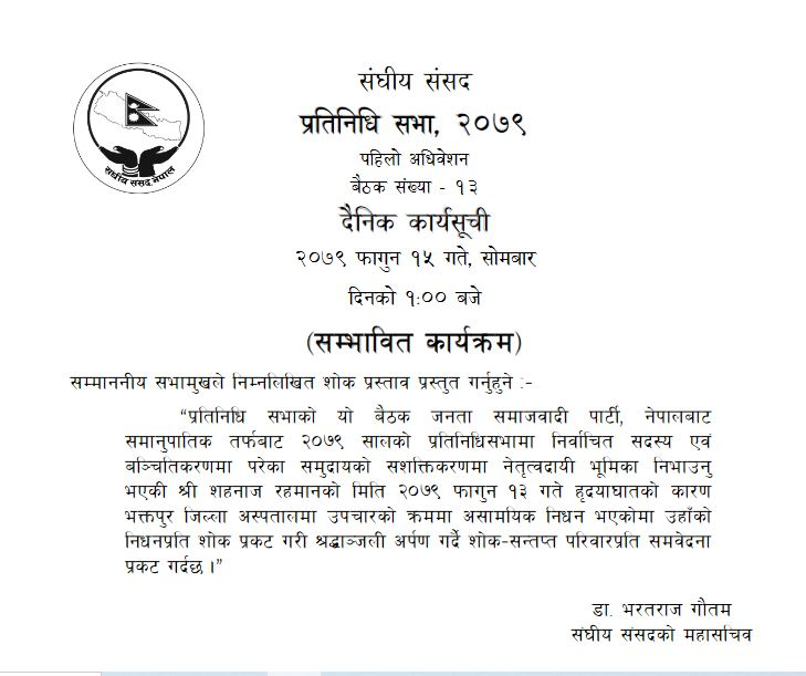 जनता समाजवादी पार्टी, नेपालबाट समानुपातिकतर्फबाट २०७९ सालको प्रतिनिधिसभामा निर्वाचित सदस्य एवं बञ्चितिकरणमा परेका समुदायको सशक्तिकरणमा नेतृत्वदायी भूमिका निभाएका शहनाज रहमानको २०७९ फागुन १३ गते हृदयघातको कारण भक्तपुर जिल्ला अस्पतालमा उपचारको क्रममा असामयिक निधन भएकोमा निधनप्रति शोकप्रकट गर्दै शोकप्रस्ताव पारित गर्ने कार्यसूची रहेको संघीय संसद्का महासचिव डा. भरतराज गौतमले जानकारी दिए ।