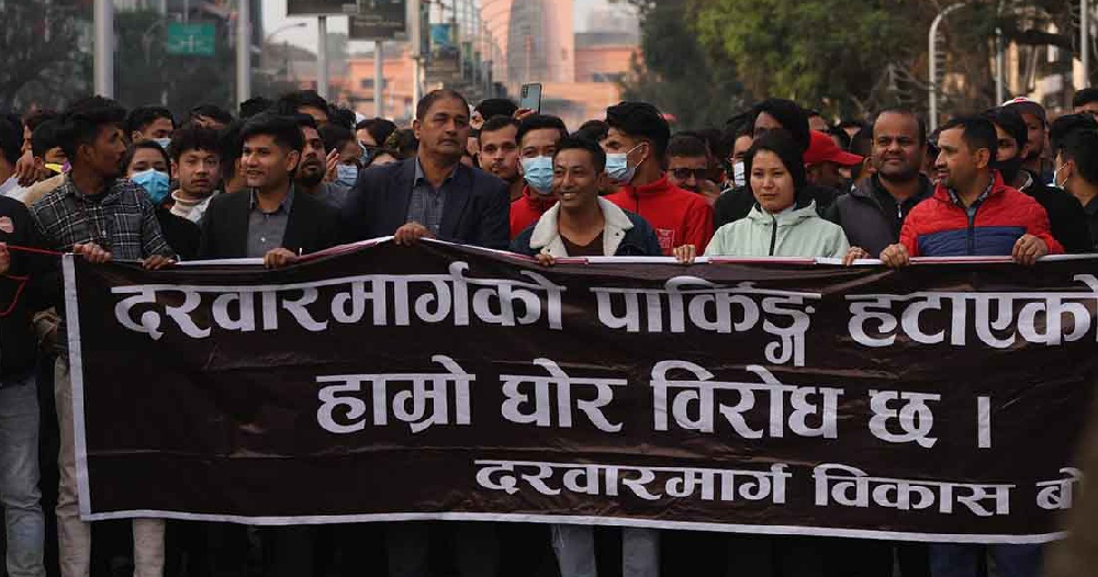 महानगरको निर्णयबमोजिम महानगरका प्रहरी बले दरबारमार्ग क्षेत्रका सडकमा रहेको सवारीसाधनको पार्किङलाई हटाएपछि यस क्षेत्रका व्यापारीहरू पार्किङको पुनः व्यवस्था हुनुपर्ने माग गर्दै सोमबार निर्णयको ‘घोर विरोध’ लिखित कालो ब्यानरसहित सडकमा आएका हुन् ।