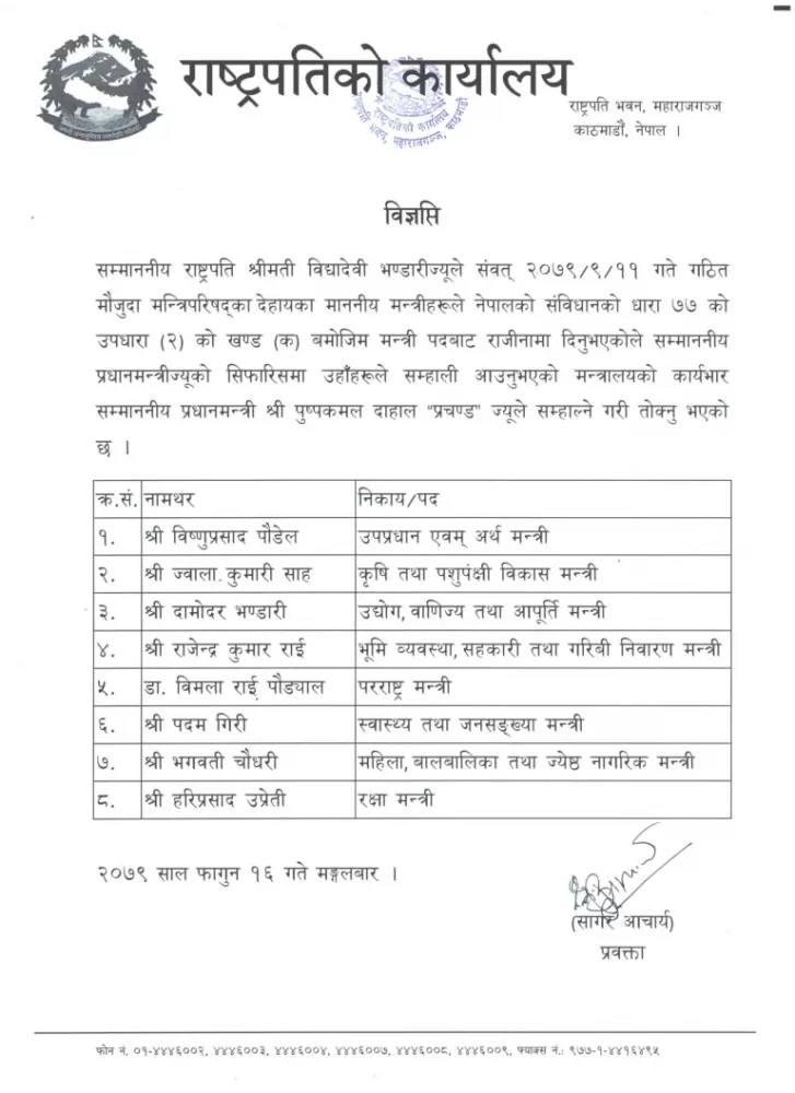 उपप्रधानमन्त्री एवम् अर्थमन्त्री विष्णुप्रसाद पौडेल, कृषि तथा पशुपक्षी विकासमन्त्री ज्वालाकुमारी साह, उद्योग वाणिज्य तथा आपूर्तिमन्त्री दामोदर भण्डारी, भूमि व्यवस्था, सहकारी तथा गरिबी निवारणमन्त्री राजेन्द्रकुमार राई, परराष्ट्रमन्त्री डा विमला राई पौड्याल, स्वास्थ्य तथा जनसङ्ख्यामन्त्री पदम गिरी, महिला बालबालिका तथा ज्येष्ठ नागरिकमन्त्री भगवती चौधरी र रक्षामन्त्री हरिप्रसाद उप्रेतीले राजीनामा दिए । उनीहरुले सम्हाल्नुभएको मन्त्रालय अब भने प्रधानमन्त्री दाहालले नै सम्हालेका छन् ।