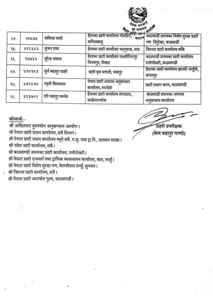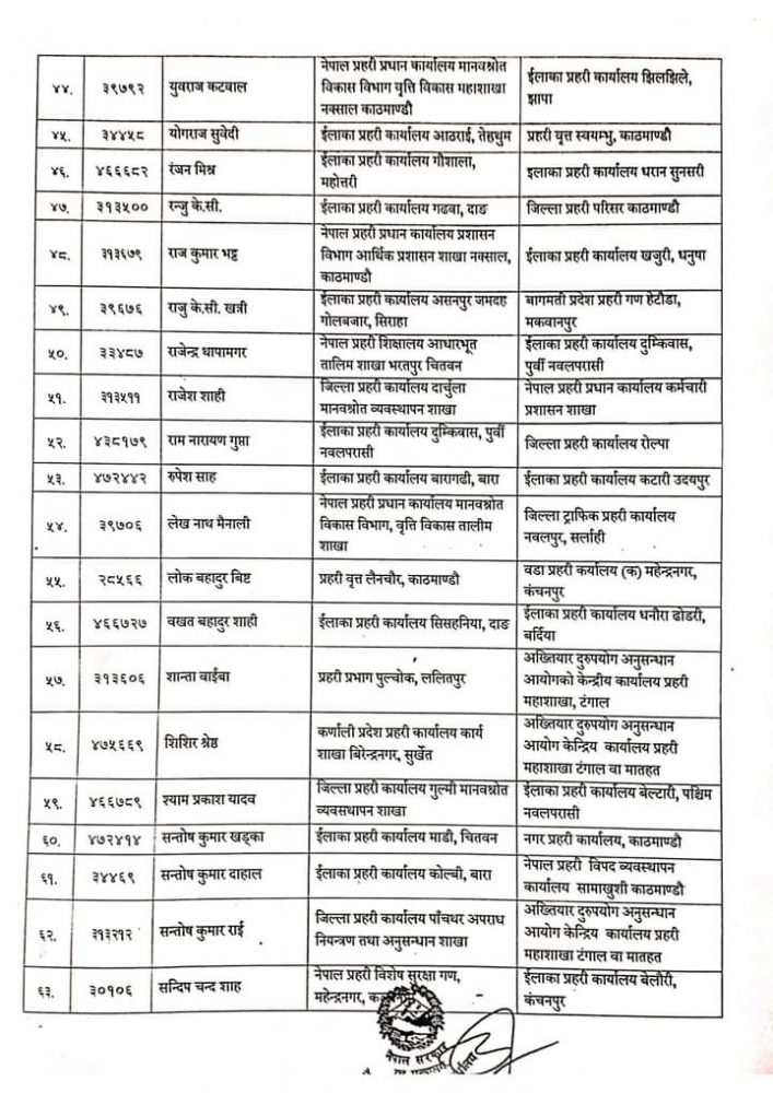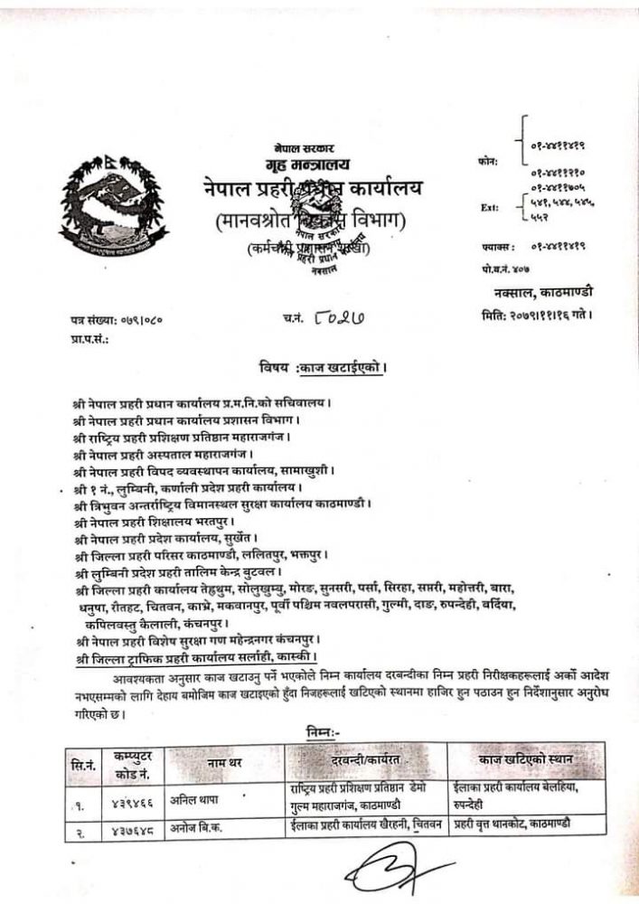 इन्स्पेक्टर प्रमुख रहने विभिन्न युनिटका नेतृत्व हेरफेर गरेको प्रहरी प्रधानकार्यालयले जनाएको छ । राष्ट्रिय प्रहरी प्रशिक्षण प्रतिष्ठान डेमो गुल्म महाराजगञ्ज, काठमाडौंमा कार्यरत प्रहरी निरीक्षक अनिल थापाको इलाका प्रहरी कार्यालय बेलहिया, रुपन्देही काज सरुवा भएको छ । यसैगरी, इलाका प्रहरी कार्यालय खैरहनी, चितवनमा कार्यरत प्रहरी निरीक्षक अनोज विकको प्रहरी वृत्त थानकोट,काठमाडौं सरुवा भएको छ ।