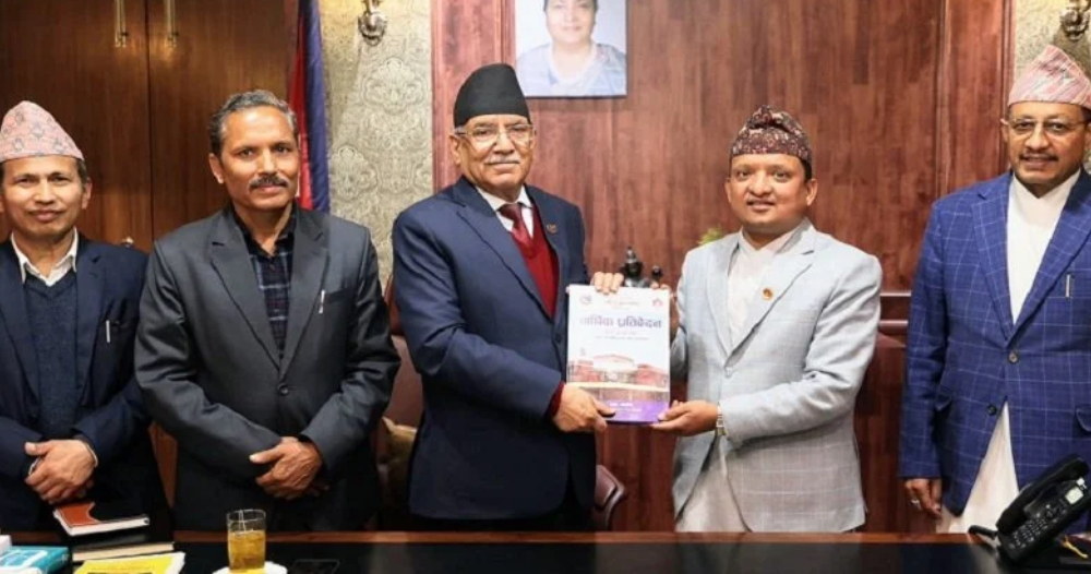 काठमाण्डौं । प्रधानमन्त्री पुष्पकमल दाहाल ‘प्रचण्ड’ समक्ष राष्ट्रिय युवा परिषद्ले वार्षिक प्रतिवेदन पेश गरेको छ । आज उनलाई सिंहदरबारस्थित प्रधामन्त्री कार्यालयमा परिषद्का कार्यकारी उपाध्यक्ष सुरेन्द्र बस्नेतले प्रतिवेदन बुझाएकका हुन । परिषद्ले आर्थिक वर्ष २०७८/७९ मा गरेका काम र गतिविधि समेटिएको छ ।
