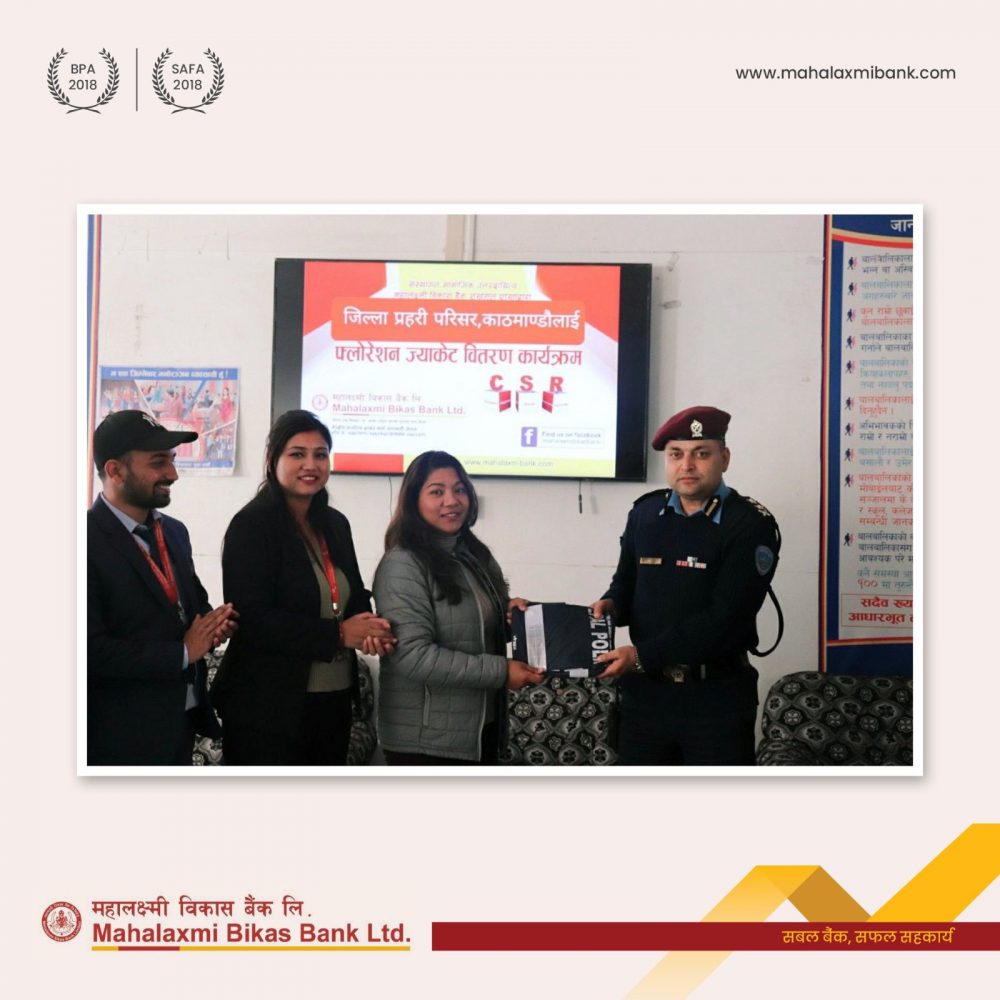 त्यसैगरी बैंकको शंखमुल शाखाद्वारा जिल्ला प्रहरी कार्यालय, टेकुलाई फ्लोरेशन ज्याकेट हस्तान्तरण कार्यक्रम सञ्चालन गरिएको छ । रात्रिकालिन समयमा सडकमा खटिएका प्रहरीहरुको जोखिम व्यवस्थापनमा सहयोग पुर्‍याउनका लागि बैंकले उक्त सहयोग प्रदान गरेको हो । जिल्ला प्रहरी कार्यालय, टेकुका प्रहरी उपरिक्षक सिताराम रिजाललाई शंखमुल शाखाका प्रमुख पुण्य श्रेष्ठले उक्त सामाग्री हस्तान्तरण गरेका हुन ।
