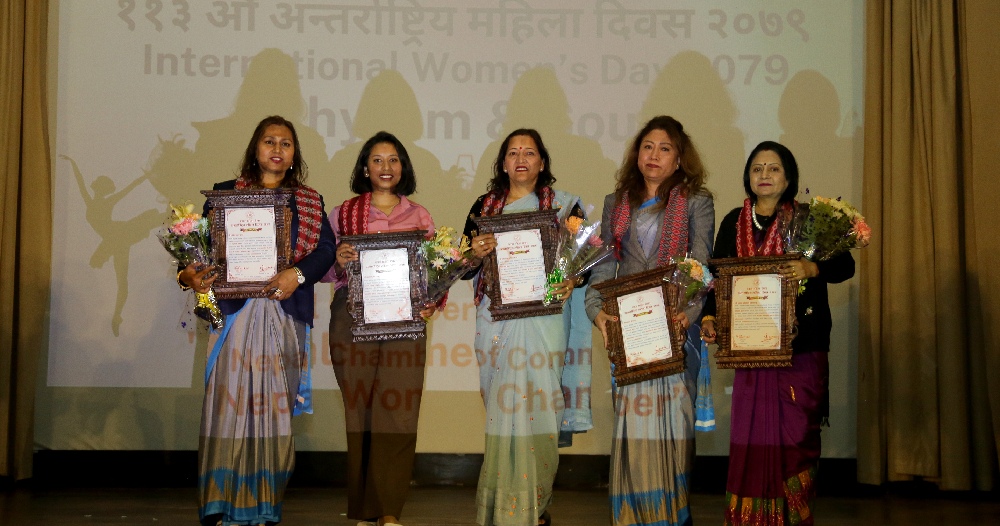 नेपाल महिला चेम्बरबाट सम्मानित हुनेमा उद्योगतर्फ शुभद्रा अधिकारी ढकाल, निर्याततर्फ पार्वता खरेल बिमली, आई टितर्फ न्हशला जोशी, कृषितर्फ सरिता भट्टराई श्रेष्ठ र स्वास्थ्य तर्फ स्वरुपा श्रेष्ठ रहेकी छन् । कार्यक्रममा राष्ट्रिय महिला आयोगकी सदस्य कृष्ण कुमारी पौडेल खतिवडाले सामाजिक संरचना विविधतापूर्ण रहेको उल्लेख गर्दै महिला हिंसा बढ्नु दुःखद भएको बताईन ।