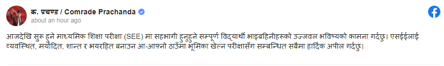 साथै प्रधानमन्त्रीले परीक्षा व्यवस्थित, मर्यादित, शान्त र भयरहित बनाउन आ-आफ्नो ठाउँमा भूमिका खेल्न परीक्षासँग सम्बन्धित सबैमा अपिल गरेका छन् ।