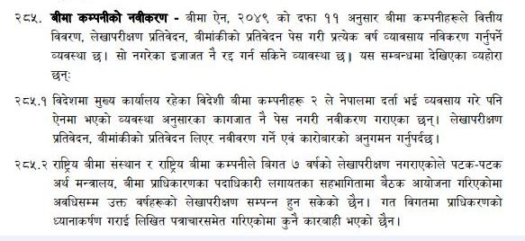 महोखाका अनुसार बीमा ऐन, २०४९ को दफा ११ अनुसार बीमा कम्पनीहरुले वित्तीय विवरण, लेखापरीक्षण प्रतिवेदन, बीमांकी प्रतिवेदन पेस गरी प्रत्येक बर्ष व्यवसाय नविकण गर्नुपर्ने व्यवस्था रहेको छ । सो नगरेमा इजाजत नं रद्ध गर्न सकिने व्यवस्था रहेको छ ।