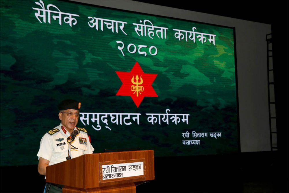 काठमाडौं । नेपाली सेनाको सङ्गठनमा रहेका सम्पूर्ण जनशक्तिलाई पदमा रहँदा तथा सेवानिवृत्त भइसकेपछि पनि गर्न हुने र नहुने गतिविधि एवं सैनिक आचारणका बारेमा सु-सूचित गराउन आचारसंहिता कार्यक्रम सञ्चालन गरिएको छ ।