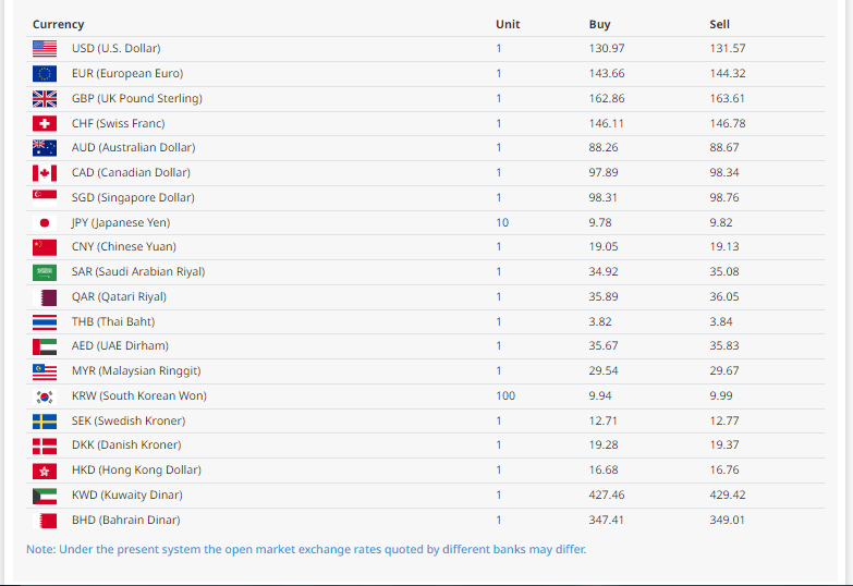 काठमाडौं । नेपाल राष्ट्र बैंकले आज (बुधबार)का लागि विदेशी मुद्राको विनिमयदर तोकेको छ । नेपाल राष्ट्र बैंककाअनुसार विदेशी मुद्राको विनिमयदर अमेरिकी एक डलरको खरिददर १३० रुपैयाँ ९७ पैसा र बिक्रीदर १३१ रुपैयाँ ५७ पैसा रहेको छ ।