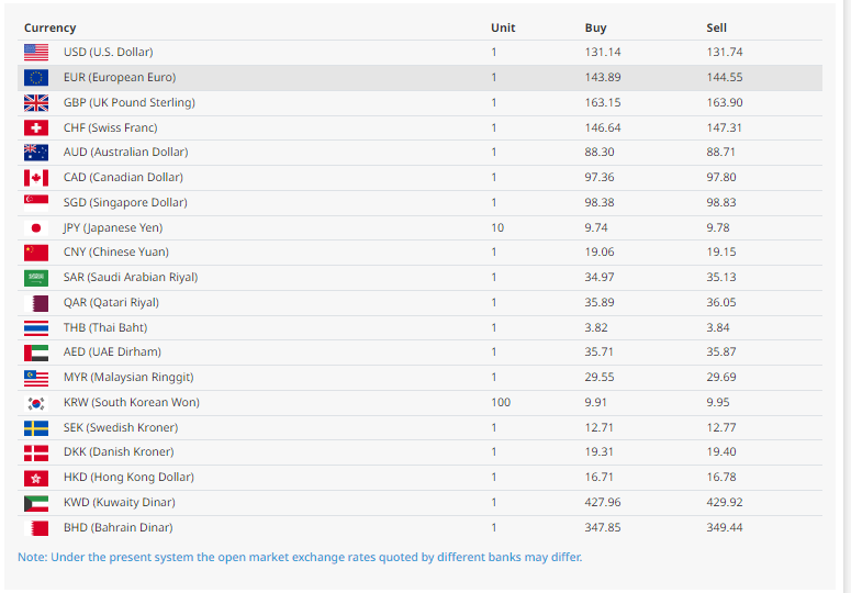 त्यस्तै, युरो एकको खरिददर १४३ रुपैयाँ ८९ पैसा र बिक्रीदर १४४ रुपैयाँ ५५ पैसा रहेको बैंकले जनाएको छ । त्यस्तै, बेलायती पाउन्ड एकको खरिददर १६३ रुपैयाँ १५ पैसा र बिक्रीदर १६३ रुपैयाँ ९० पैसा रहेको छ भने, कतारी रियाल एकको खरिददर ३५ रुपैयाँ ८९ पैसा र बिक्रीदर ३६ रुपैयाँ ०५ पैसा रहेको राष्ट्र बैंकले जनाएको छ ।