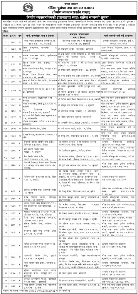 आर्थिक वर्ष २०७९/८० का लागि गत चैत्र मसान्तभित्र इजाजत पत्र नवीकरण गर्न निर्माण व्यवसायीहरूलाई आग्रह गरे पनि नवीकरण नगरेकाले इजाजत पत्र खारेज गरेको मन्त्रालयले जनाएको छ ।